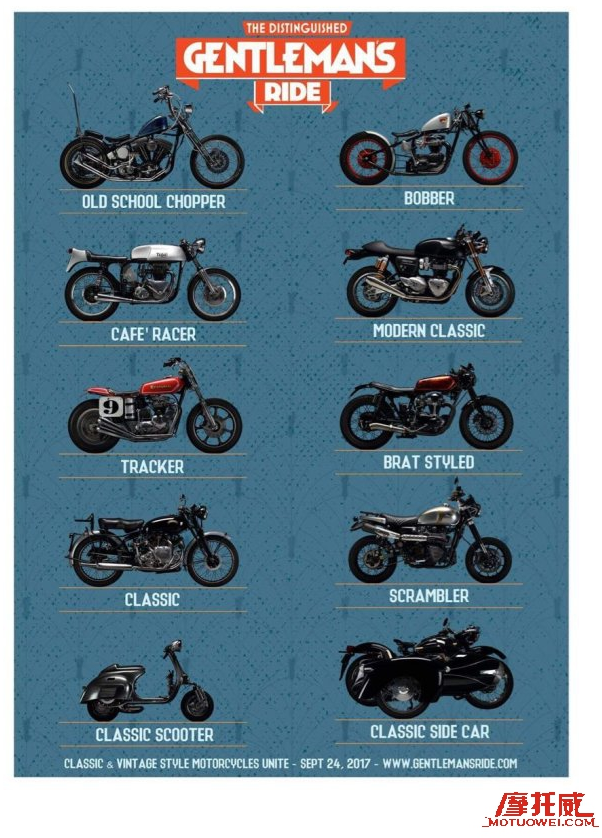 最常见的也是最为大家所熟悉的复古车改装风格应该就是Cafe Racer了,但是除此之外还有着很多种改装风格,这张图其实也并没有将所有的改装风格都总结到位,而且在现在有着很多改装并不严格的归属于某一类改装。