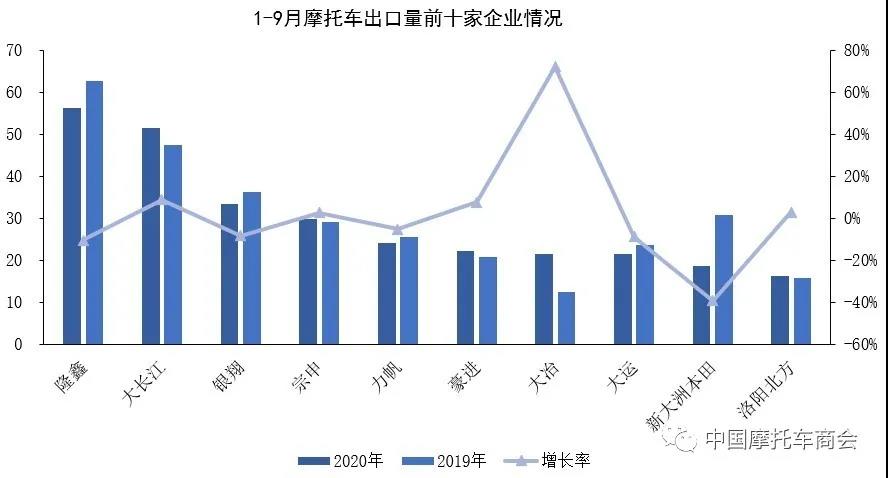 1-9月,摩托车出口量排名前十位的企业依次为:隆鑫、大长江、银翔、宗申、力帆、广州豪进、大冶、大运、新大洲本田、洛阳北方,上述十家企业共出口295.75万辆,占摩托车出口总量的61.02%。