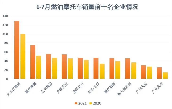 1-7月,燃油摩托车销售前十名企业(集团)为大长江、隆鑫、宗申、力帆、银翔、新大洲本田、洛阳北方、五羊-本田、广州大运和广东大冶分别销售129.1万辆、74.85万辆、55.85万辆、54.77万辆、46.63万辆、46.51万、46.05万辆、45.64万辆、30.5万辆和25.99万辆。