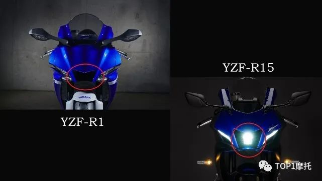 其中,R1/R1M和R6的大灯在日行灯下面左右各一个,中央部分是硕大的进气口。而双缸的R7/R3以及排量更小的R15,因为无需车头进气,原本进气口的位置,就变成了安装大灯最合适的地方,当然车头灯也因此变成了单灯。