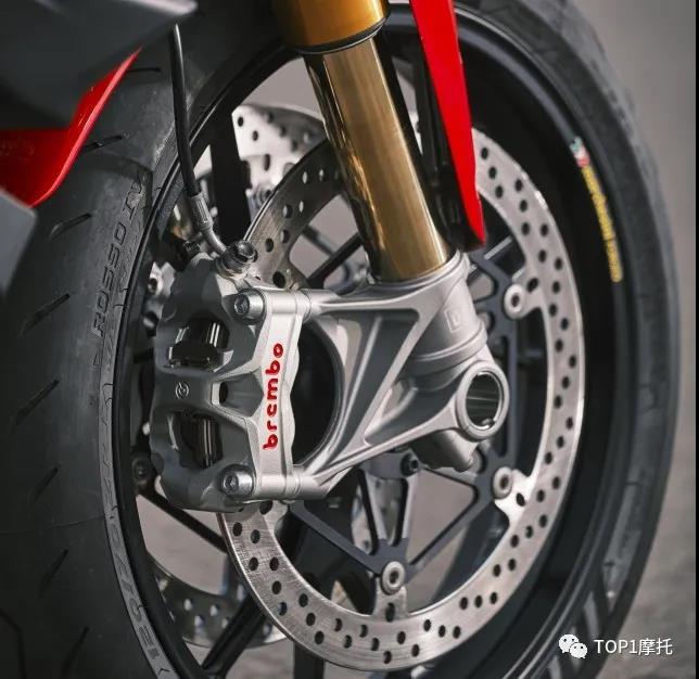 制动系统使用与Multistrada V4 S相同的,Brembo M50 Stylema整体式卡钳,但换上了 Panigale V4的刹车片,三级Bosch-Brembo ABS 10.3ME弯道ABS也是标准配置。