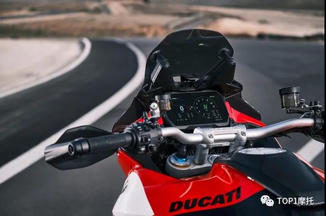 因此与普通版相比,骑行三角更具运动性,杜卡迪还将脚踏板升高并向后移,以增加最大倾斜角度。车把也变得更低更窄,营造出更具侵略性的骑行姿势。因此,派克峰版的的挡风比普通版低。