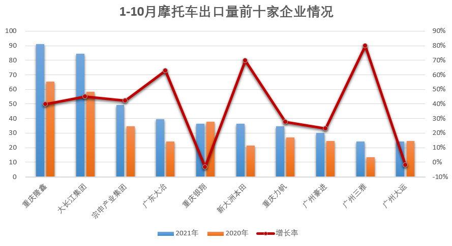 1-10月,摩托车出口量排名前十位的企业依次为:隆鑫、大长江、宗申、大冶、银翔、新大洲本田、力帆、广州豪进、三雅、大运,上述十家企业共出口450.6万辆,占摩托车出口总量的61.37%。