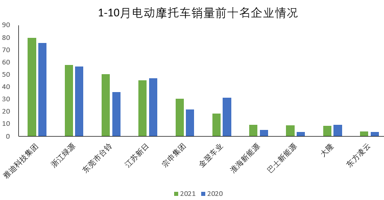 1-10月,电动摩托车销售前十名企业(集团)为雅迪科技集团、浙江绿源、东莞台铃、江苏新日、宗申集团、金翌、淮海新能源、济南大隆、巴士新能源和东方凌云,分别销售79.67万辆、58.02万辆、50.23万辆、45.38万辆、30.64万辆、18.52万、9.45万辆、8.93万辆、8.59万辆和3.86万辆。