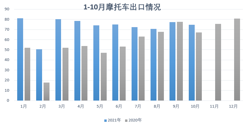 10月我国摩托车出口环比下降,同比再次恢复增长。全球需求的逐渐复苏,摩托车出口延续向好的态势,累计出口量保持较高的增长幅度。但原材料价格上涨和运价的持续攀升,也给摩托车出口带来一定的压力。