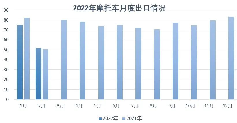 2月我国摩托车出口环比下降,同比增长,1-2月累计出口量与去年相比小幅下降。今年以来,国外通胀压力加大,物流、原材料成本上涨,摩托车出口金额同比明显增长。从整体看,我国摩托车外贸需求基本稳定。