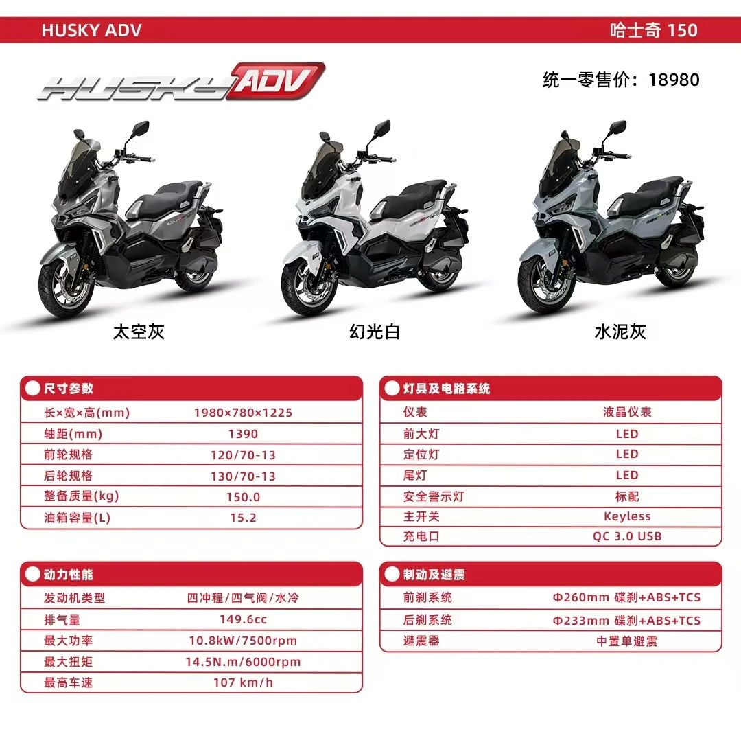 HUSKY ADV150搭配ABS防抱死刹车系统+TCS牵引力系统。