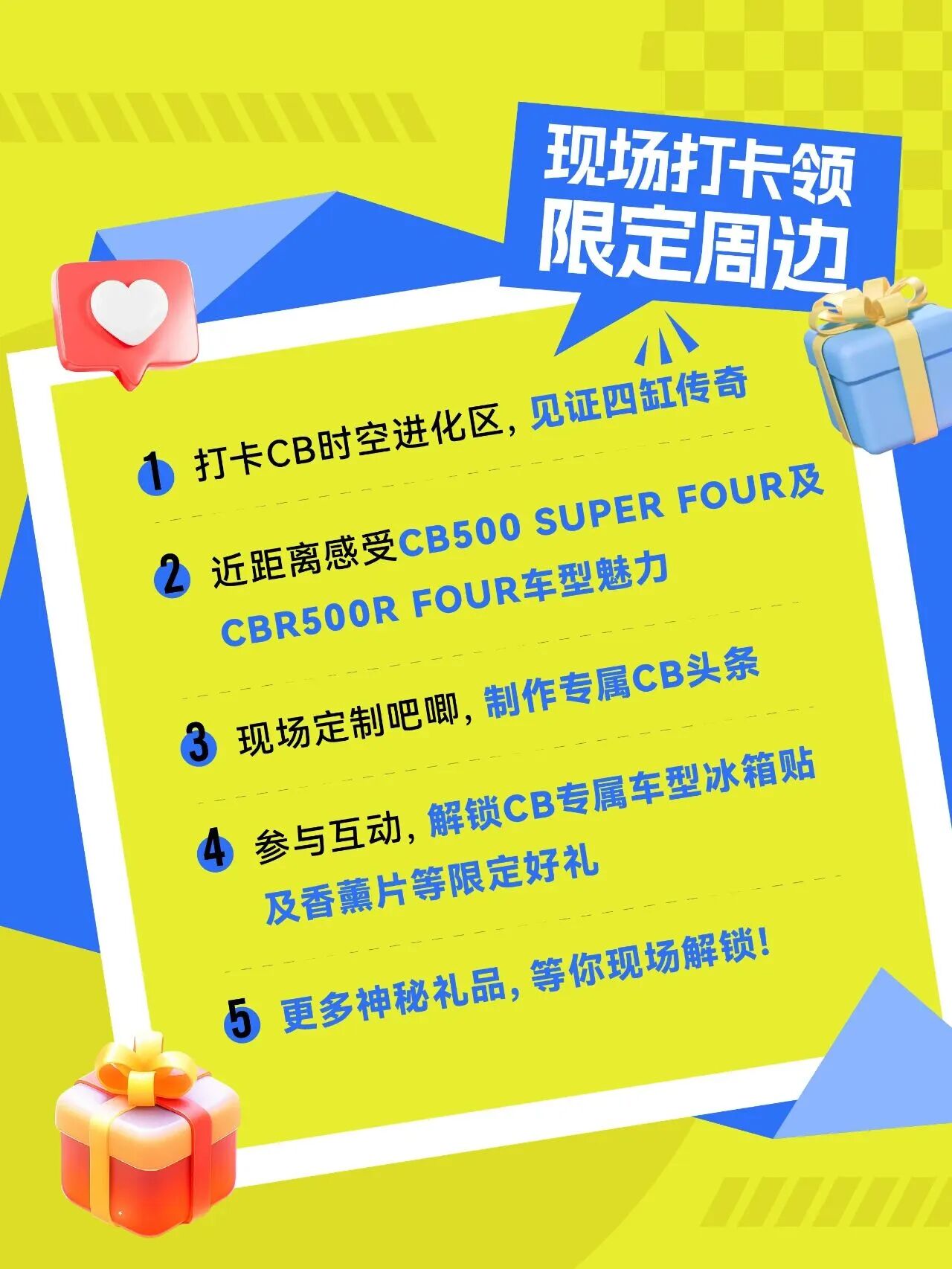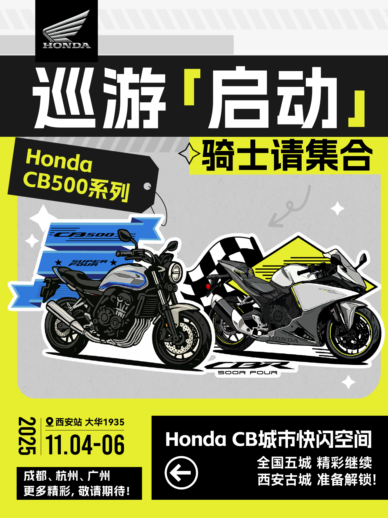 Honda CB城市快闪全国五城巡游,下一站:西安!11月初,这场潮酷的机车派对即将登陆古城!爆款精彩揭秘:打卡未来感时空专区近距离体验CB500系列打卡即领奖:1.拍1张现场图并发布小红书,即可领取定制吧唧或头条报纸2.拍3张(含CB500车型),即可领CB专属包/冰箱贴/方巾3.11月初,即将开启4.西安站大华1935,敬请期待!